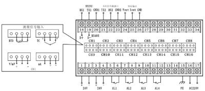 c .分别控制/报警输出:即仪表各测量通道均有一个(或两个)报警继电器输出报警,报警输出互相独立。或各测量通道均有一组相互独立的变送控制输出。当输入通道≤8时,可选择分别带上下限/路报警输出,当输入通道>8、≤16时,可选择上限或下限/路报警输出。